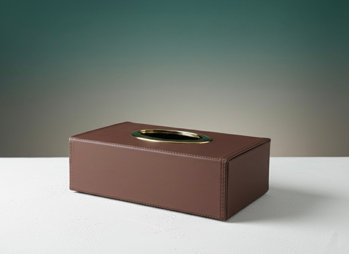 Crafted from rich, durable brown faux leather with precise, reinforced stitching, it exudes quality. The centerpiece is the elegant brass or gold-tone oval opening, which adds a touch of classic luxury and ensures smooth tissue dispensing every time.